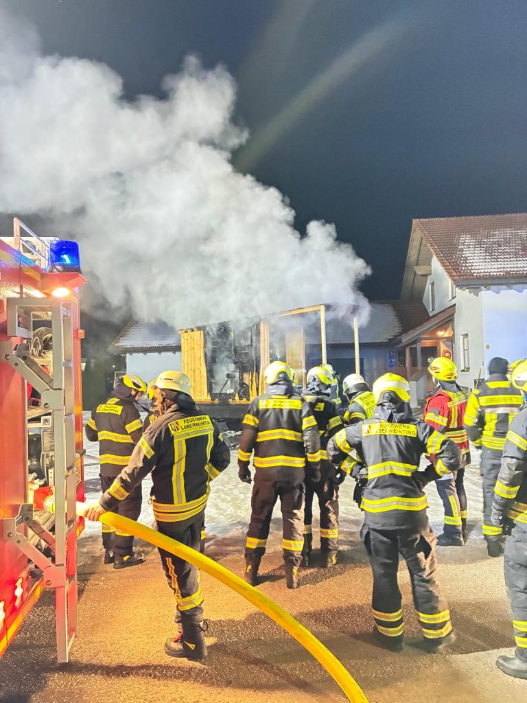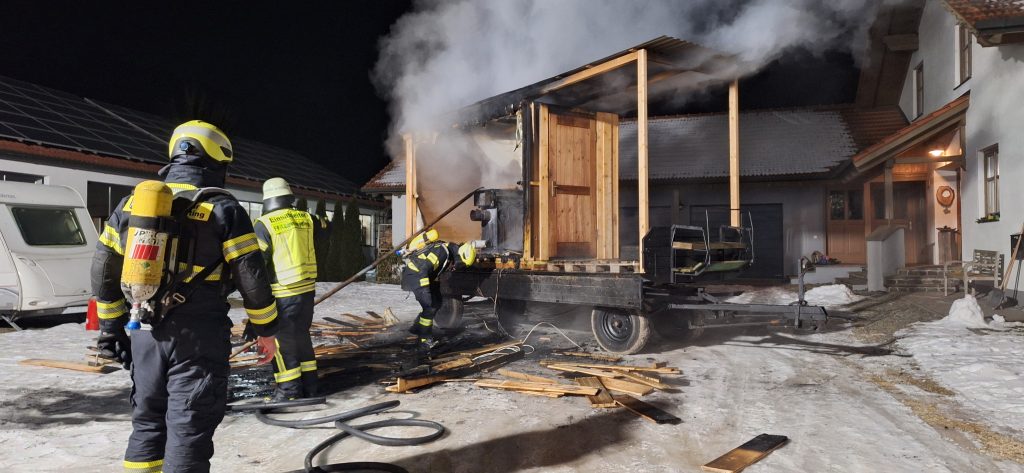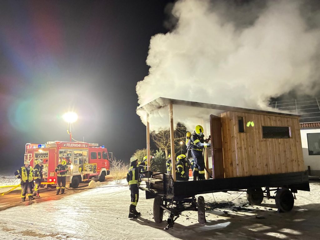 Am Freitagabend (23.01.2026, 18:56 Uhr) wurde die FF Laberweinting zum Brand einer Werkstatt bzw. eines Anbaus alarmiert. Wie sich bereits bei der kurzen Anfahrt herausstellte, handelte es sich entgegen der Meldung aber um eine mobile Sauna, die auf einem Anhänger aufgebaut war. Ein Übergreifen auf andere Gebäude konnte durch die geistesgegenwärtige Reaktion des Besitzers verhindert werden, da dieser den Anhänger auf eine freie Hoffläche zog.